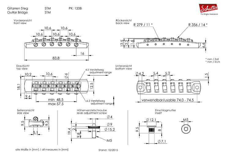 Schaller TOM style bridge compatible with post spacing between 74.0 and 74.5 mm